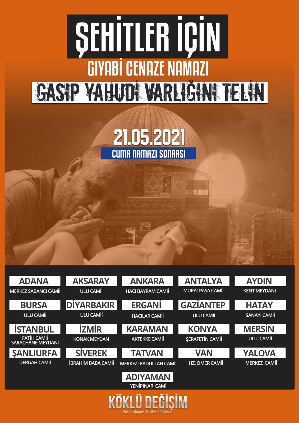 Köklü Değişim tarafından organize edilen gıyabi cenaze namazları için yapılan açıklamada, “Terör varlığı İsrail pervasız saldırılarına devam ediyor. İşgalci varlık yine dünyanın gözü önünde masum Filistinli kardeşlerimizi füze ve bombalarla katlediyor. Gaspçı Yahudi halkı İsrail’in işlediği suçları çılgınca eğlenerek kutluyor. İslam ülkelerinin yöneticileri ise her zamanki gibi kınama yarışına girip Birleşmiş Milletler (BM)’den yardım bekliyor. Köklü Değişim olarak şehit edilen kardeşlerimize gıyabi cenaze kılmak, gasıp Yahudi varlığını telin etmek ve İslam ümmetinin ordularına çağrıda bulunmak için Cuma namazı sonrası Türkiye’nin birçok şehrinde toplanıyoruz. Kalbi Filistin ve Mescid-i Aksa için atan tüm Müslümanları etkinliklerimize katılmaya davet ediyoruz.” ifadeleri kullanıldı.