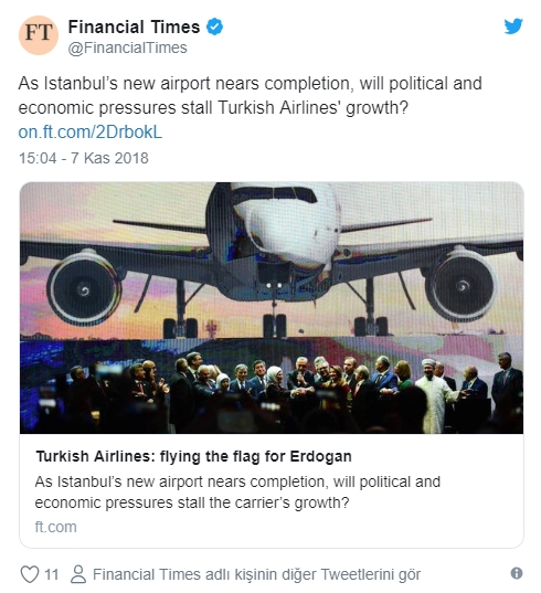 İngiliz gazetesi Financial Times gazetesi, son 15 yılda Türk Hava Yolları'nın iki katı oranında büyüdüğüne dikkat çekti. Gazete, "Türk Hava Yolları, Erdoğan'la birlikte uçuşa geçti" ifadelerini kullandı.