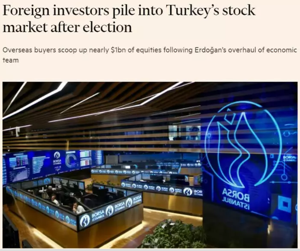 "Yabancı yatırımcılar seçimin ardından Türkiye borsasına akın ediyor" başlıklı haberde, yurt dışı alıcıların, Erdoğan'ın ekonomi ekibini yeniden kurmasının ardından yaklaşık 1 milyar dolarlık hisse senedi aldığı belirtildi.
