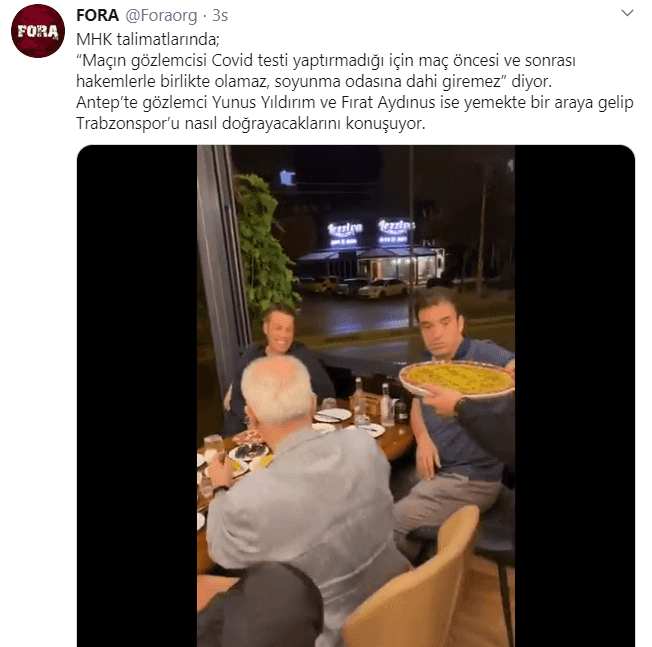 Gaziantep FK-Trabzonspor maçının tartışılan hakemi Fırat Aydınus'un sosyal medyada ortaya çıkan görüntüsü tepki çekti. Talimatlara aykırı olmasına rağmen Aydınus'un mücadelenin gözlemcisi Yunus Yıldırım'la yemek yediği görüldü.