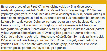 Aydın’da oturan yüzde 50 engelli Engin E. hediyelik eşya satmak için İzmit’e giti. Aydın’dan tanıştığı, Fırat Delikanlı lakaplı Fırat Kaya, Engin E.’nin sattığı hediyelik eşyaların parasını vermediği gibi onu 4 arkadaşı ile birlikte dağ evine görürüp darp etti. Engin E.’nin darp ettiği görüntüleri sosyal medyada paylaşında Twitter’da tepkiler geldi. Gelen tepkiler üzerine polis harekete geçti.