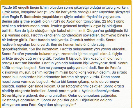 Fırat Kaya yakalandı mı? Kocaeli Emniyet Müdürlüğü ekipleri, Fırat Kaya'yı yakalayarak gözaltına aldı. Son gelen bilgilere göre Kaya'nın ifadesi alınıyor. Kocaeli Cumhuriyet Başsavcılığı işitme engelli Engin E.’nin, Delikanlı' lakaplı Fırat K. tarafından dövülmesi olayına ilişkin açıklama yaptı. Fırat K. hakkında soruşturma başlatıldığı belirtilen açıklamada, şöyle denildi: “Müşteki E.E. polis merkezine başvuru yaparak, 22 Mart tarihinde tehdit ve hakarete maruz kaldığını ve darp edildiğini ifade etmiş, şüpheliler hakkında şikayetçi olmuştur. Yapılan araştırma kapsamında elde edilen delil ve bulgular doğrultusunda eylemi gerçekleştiren şüpheli F.K. ve ona yardım eden diğer şüpheliler hakkında 'Kasten adam öldürmeye teşebbüs', 'Kişiyi hürriyetinden yoksun kılma', 'Özel hayatın gizliliğini ihlal' ve 'Kişisel verileri hukuka aykırı olarak yayma' suçlarından Cumhuriyet Başsavcılığımızca soruşturma başlatılmıştır. Soruşturma kapsamında kolluk güçlerine şüphelilerin gözaltına alınmaları talimatı verilmiştir. Soruşturmamız titizlikle sürdürülmektedir.”