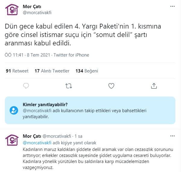 Mor Çatı, sosyal medyadan yaptığı açıklamada, “Dün gece kabul edilen 4. Yargı Paketi'nin 1. kısmına göre cinsel istismar suçu için “somut delil” şartı aranması kabul edildi. Kadınların maruz kaldıkları şiddete delil aramak var olan cezasızlık sorununu arttırıyor; erkekler cezasızlık sayesinde şiddet uygulama cesareti buluyorlar. Kadınlara yönelik yürütülen bu saldırılara karşı mücadelemizden vazgeçmiyoruz” ifadelerine yer verdi.