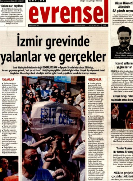 Evrensel gazetesi ise ‘İzmir grevinde yalanlar ve gerçekler’ başlıklı manşet haberiyle grev nedeniyle yıpranan CHP’li belediyeler yerine personelinin huzur içinde çalıştığı AK Parti belediyeciliğini hedef aldı.