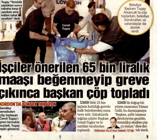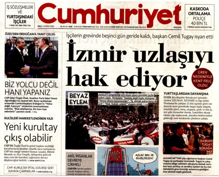 Sarı sendikalar ile içli dışlı olan ve çikolata kutularında aldığı rüşvet paralarıyla sipariş haberler yapan Cumhuriyet gazetesi de işçilerin hakkını savunmak yerine CHP’li belediyelerden yana tavır aldı. Cumhuriyet gazetesi bugünkü nüshasında ‘İşçilerin grevinde beşinci gün geride kaldı, Başkan Cemil Tugay isyan etti’ üst başlığıyla, binlerce çalışanı mağdur eden İzmir Büyükşehir Belediye Başkanı Cemil Tugay’dan taraf oldu.