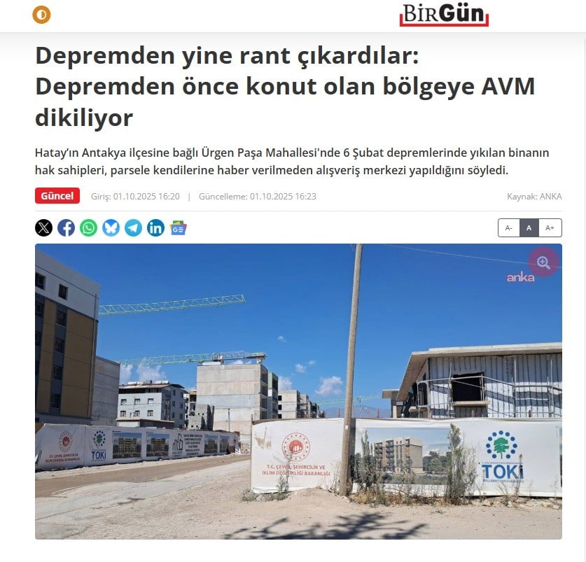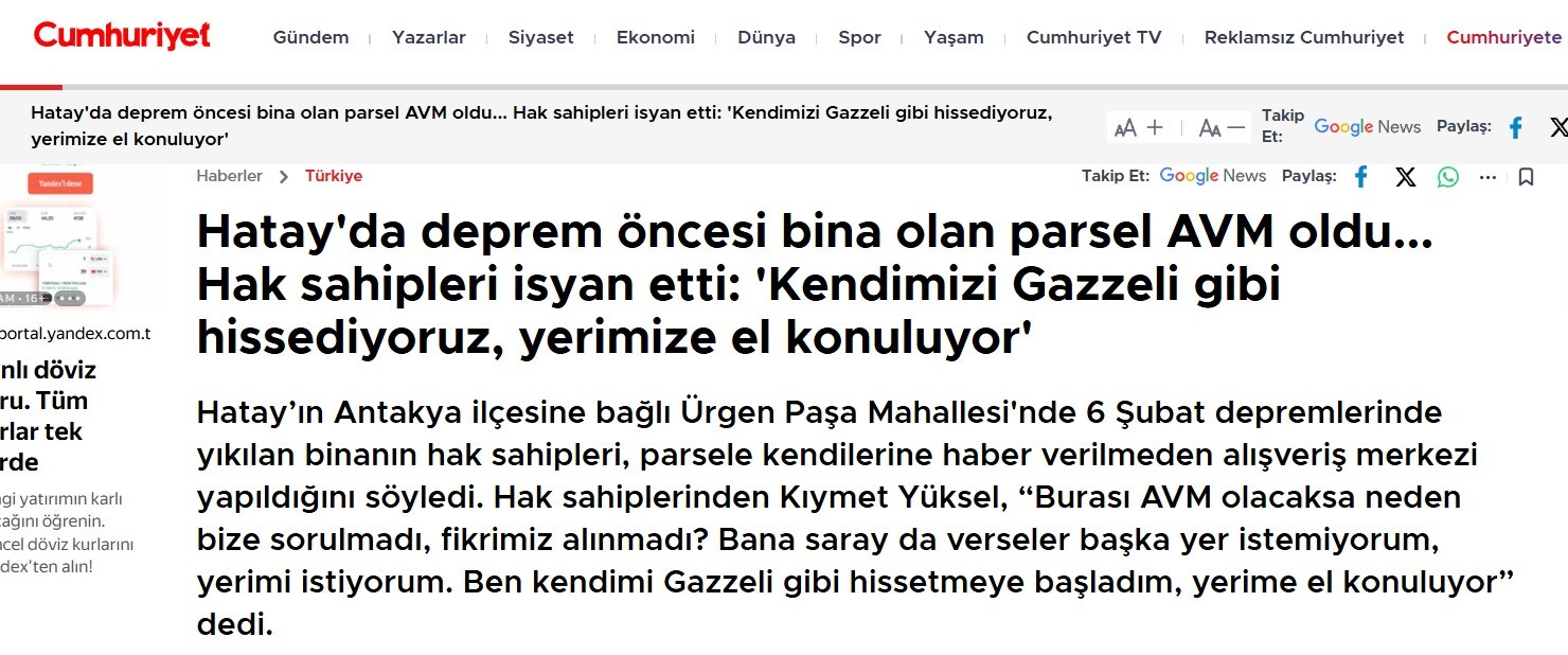 CHP’nin fonladığı Cumhuriyet ve BirGün gazetesinin “6 Şubat depremlerinde yıkılan binanın yerine alışveriş merkezi yapıldı” haberleri, Çevre Şehircilik ve İklim Değişikliği Bakanlığından açıklama yapılarak yalanlandı. Yapılan açıklamada "Hatay'ın Antakya ilçesinde 6 Şubat depremlerinde yıkılan binanın yerine alışveriş merkezi (AVM) yapıldığı" iddialarının gerçeği yansıtmadığını belirtildi.