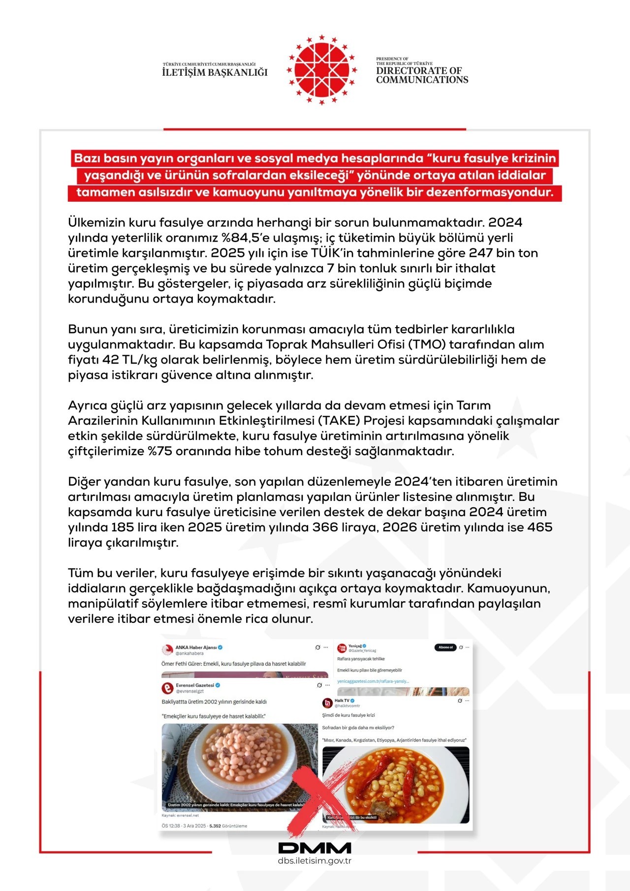 DMM'nin NSosyal'deki hesabından yapılan açıklamada, bazı basın yayın organlarında ve sosyal medya hesaplarında yer alan "kuru fasulye krizinin yaşandığı ve ürünün sofralardan eksileceği" yönündeki iddiaların tamamen asılsız, kamuoyunu yanıltmaya yönelik bir dezenformasyon olduğu belirtildi.