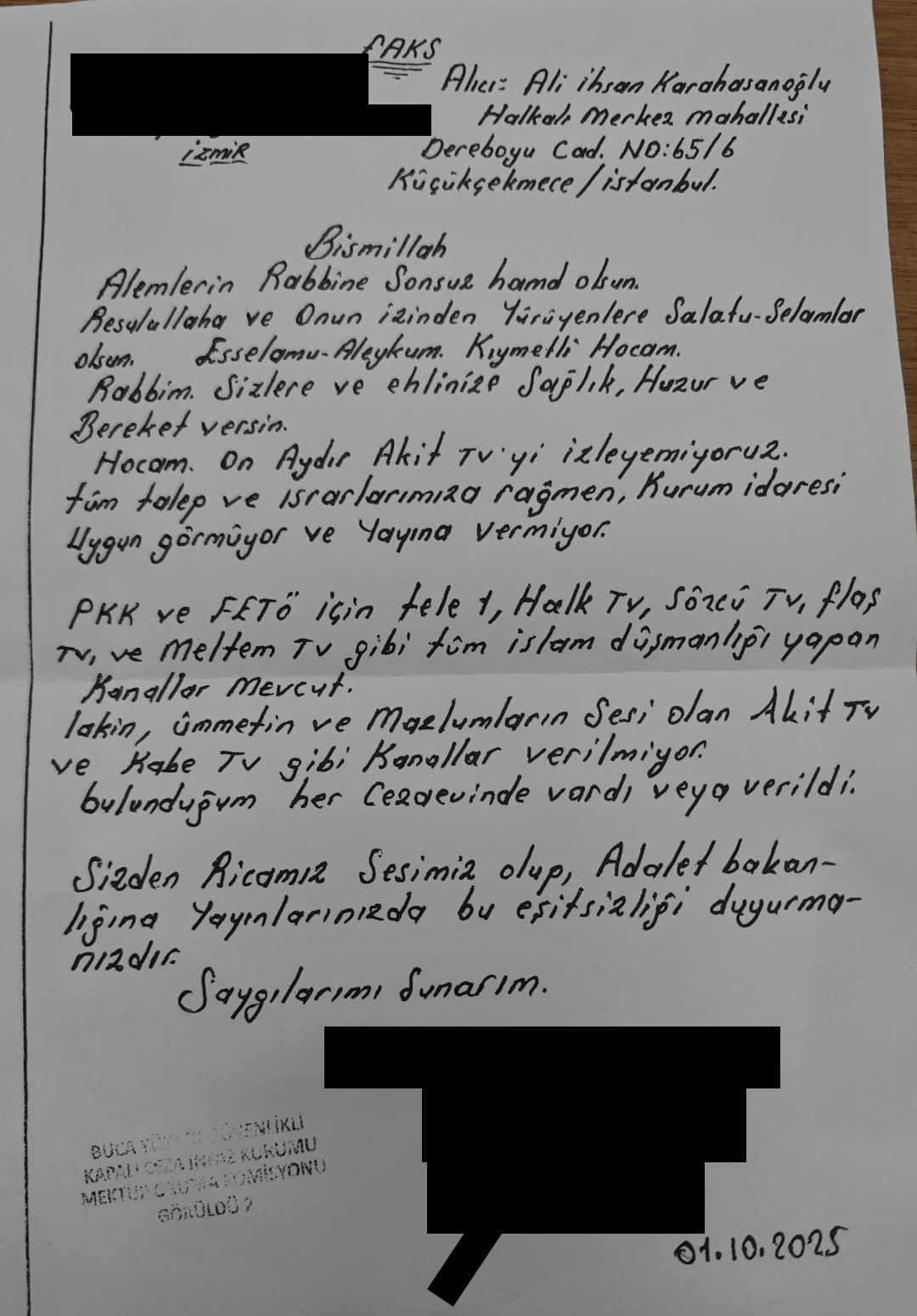 Akit TV’ye uygulanan yasağın sebebini öğrenmek için ulaşmaya çalıştığımız Buca Yüksek Güvenlikli Kapalı Ceza İnfaz Kurumu, yasağın olmadığını öne sürerek kafa karıştıran bir cevap verdi. 01.10.2025 tarihinde kaleme alınan ve cezaevi Mektup Okuma Komisyonu tarafından “görüldü” damgası vurulan ihbar mektubunda yer alan “On aydır Akit TV’yi izleyemiyoruz. Tüm talep ve ısrarlarımıza rağmen, kurum idaresi uygun görmüyor ve yayına vermiyor” ifadesine rağmen, “mahkûmlardan böyle bir yazılı talebin olmadığını” iddia etti. Ortada “görüldü” damgalı somut şikâyet mektubu dururken, İzmir Buca Yüksek Güvenlikli Kapalı Ceza İnfaz Kurumu yönetimince böyle bir cevap verilmesi, Akit TV’ye yönelik bir “kasıt mı var?” sorunu akıllara getirdi.