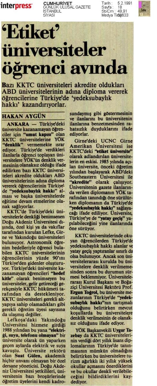 5 Şubat 1991 tarihli nüshasında “‘etiket’ üniversiteler öğrenci avında” başlığıyla okurlarının karşısına çıkan Cumhuriyet gazetesi, KKTC’de kurulan üniversitelerin ABD üniversiteleri adına diploma verdiğini ve mezun olanların ise yedek subaylık yapabileceklerini yazmıştı.