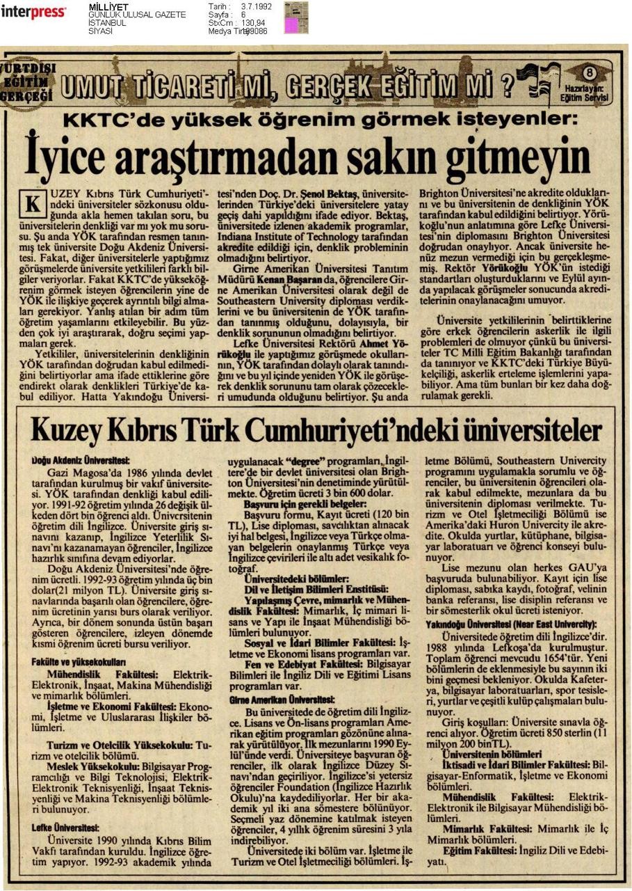 3 Temmuz 1992 tarihli Milliyet gazetesi ise ‘Umut ticareti mi, gerçek eğitim mi?’ manşetiyle çıkarken ‘KKTC’de yüksek öğrenim görmek isteyenler iyice araştırmadan sakın gitmeyin uyarısında bulunmuştu.