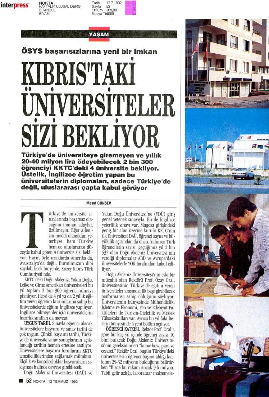 Nokta dergisi ise Temmuz 1992 tarihli sayısında ‘ÖSYS başarısızlarına yeni bir imkân’ şeklinde duyurduğu haberinde, ‘Kıbrıs’taki üniversiteler sizi bekliyor’ ifadelerini kullanarak KKTC’de mukim olan dört üniversitenin 2 bin 300 öğrenci alımı yapacağını duyurmuştu.