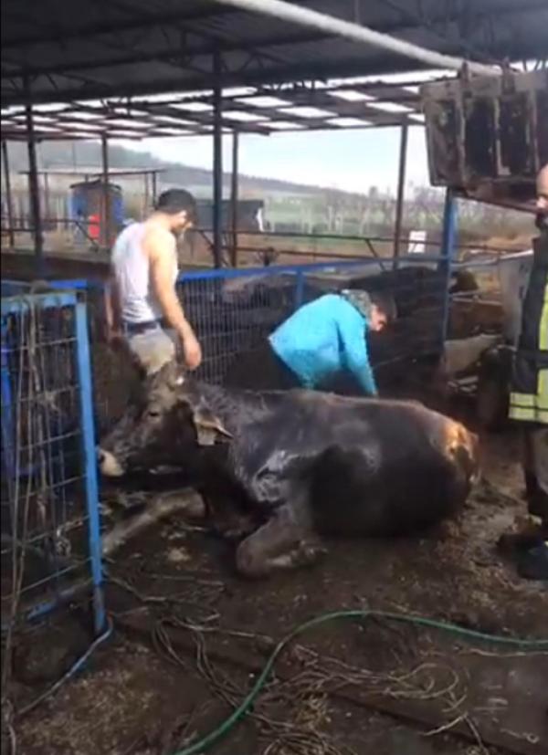 İzmir Tire'de bulunan Nevzat Eldem'e ait çiftlikte foseptik çukuruna düşen inek, itfaiye ekiplerinin çalışması sonucunda kurtarıldı.