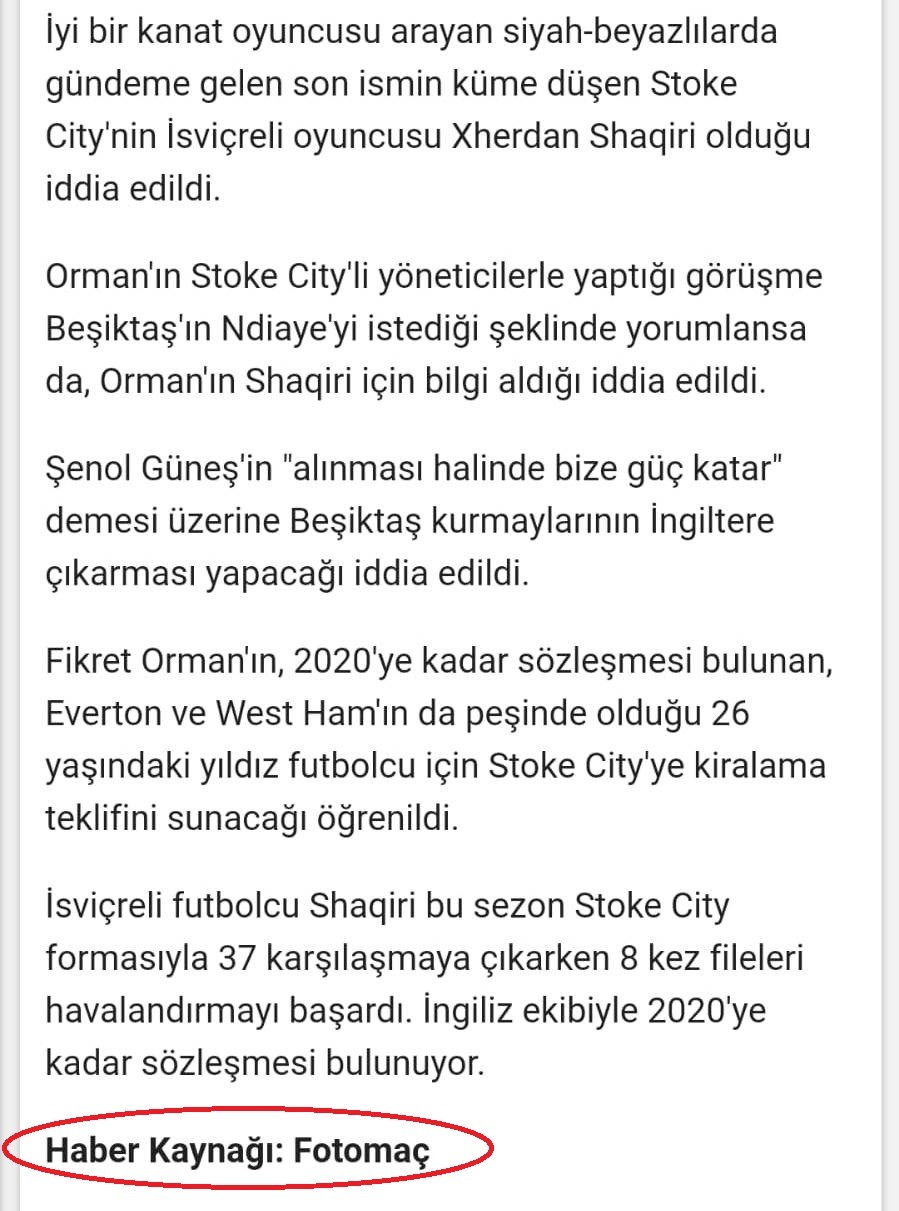 Yayınladığımız haberden günler sonra Fotomaç gazetesi de Beşiktaş’ın transfer harekatında Xherdan Shaqiri ile ilgilendiğini bire bir aynı ifadelerle ‘özel haber’ diye servis etti. Fotomaç’ın günler önce duyurduğumuz haberi ‘özel haber’ şeklinde yayınlaması şaşkınlıkla karşılandı.