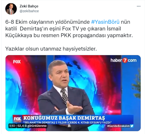 "6-8 Ekim olaylarının yıldönümünde Yasin Börü'nün katili Demirtaş'ın eşini Fox TV'ye çıkaran İsmail Küçükkaya, bu resmen PKK propagandası yapmaktır. Yazıklar olsun utanmaz haysiyetsizler."