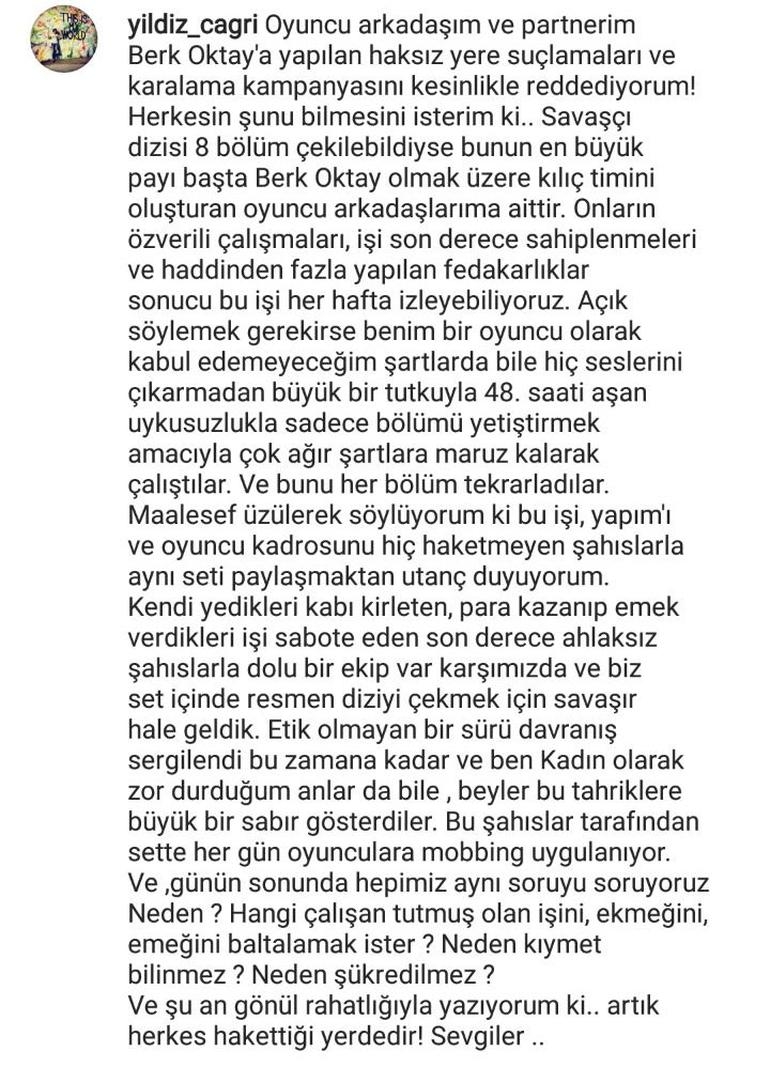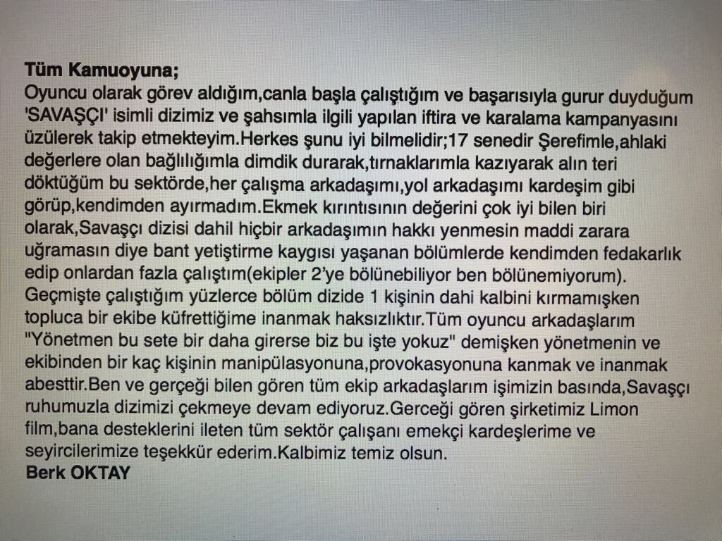 “Bizler Limon Yapım’ın Fox TV’de yayınlanan Savaşçı dizisinin teknik ekibi olarak, bu sabaha karşı sahne çekimi sırasında başrol oyuncusu Berk Oktay’ın tüm ekibe ağır hakaretler ve küfür ederek seti terk etmesinden dolayı Berk Oktay ile çalışmayı reddederek kendisini boykot ediyoruz. Bu kararımızı tüm kamuoyuna duyururuz.”