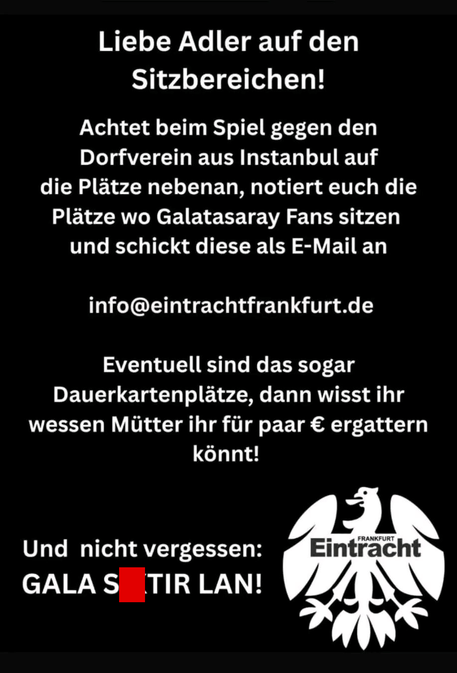 Frankfurt taraftarları, Galatasaray maçında aralarına Galatasaraylı taraftarların sızma ihtimaline karşı bildiri yayınladı: “Sevgili tribünlerdeki kartallar! İstanbullu köy takımına karşı oynayacağımız maçta yanınızdaki koltuklara dikkat edin, Galatasaraylı taraftarların oturduğu koltukları not edin ve bize gönderin. Belki de bunlar kombinelerini verenlerdir, böylece birkaç euro karşılığında kimin annesini alabileceğinizi öğrenirsiniz! Ve unutmayın: GALA S*KTİR LAN!" açıklamasında bulundu.