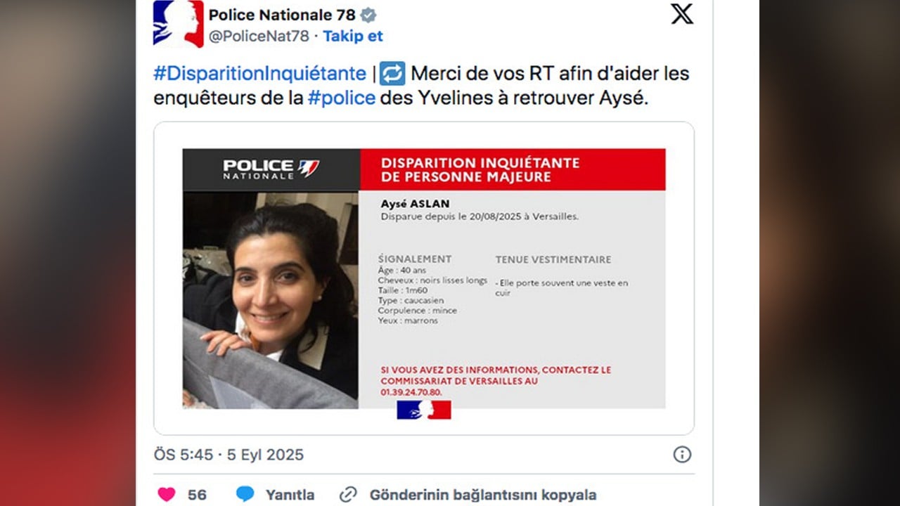 Polis, Ayşe Aslan’ı gören ya da nerede olabileceğine dair bilgi sahibi olanların, 01 39 24 70 80 numaralı telefondan Versailles Emniyet Müdürlüğü’ne ulaşmalarını istedi.