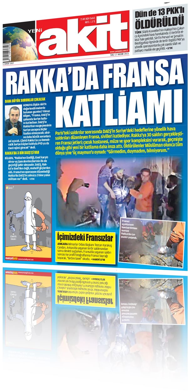 Suriye’deki olayları yakından takip eden gazeteciler arasında yer alan ve Suriye’de bulunan Yılmaz Bilgen, gazetemize yaptığı değerlendirmede, “Rakka’nın özelliği Esed karşıtı Ahrar-uş Şam devrimcilerinin ilk ele geçirdiği şehir olma özelliği taşımasıdır. DAEŞ, Rakka’yı Esed’den değil muhalif güçlerden aldı. Fransa’nın operasyon düzenlediği Rakka’da DAEŞ’in yalnızca 3 bine yakın militanı var” dedi.
