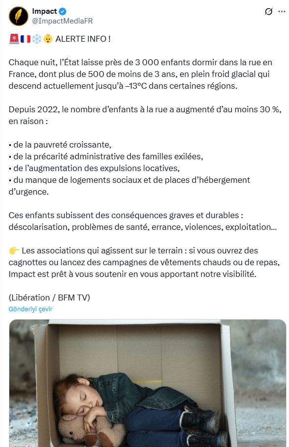 Fransa’da soğuk hava kimi bölgelerde eksi 13 dereceye kadar düşerken, devlet her gece çoğu 3 yaşın altında 500’den fazlası olmak üzere yaklaşık 3 bin çocuğu sokaklarda bırakıyor.
