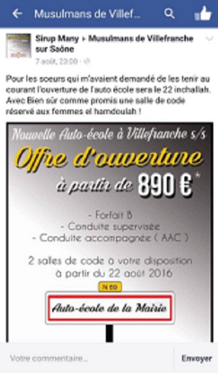 Sürücü kursu 22 Ağustos'ta tesisin açılışını duyururken, "Villefranche-sur-Saône Müslümanlar" Facebook sayfasında, "derslerde kadınlar için ayrılmış bir sınıf olacağı" duyurusu yayınlandı. Sürücü kursu yöneticisi kadın eğitmen sayfada, "sürüş dersleri kadınlar için özel olarak benim tarafımdan yapılacaktır" cümlelerini paylaştı.