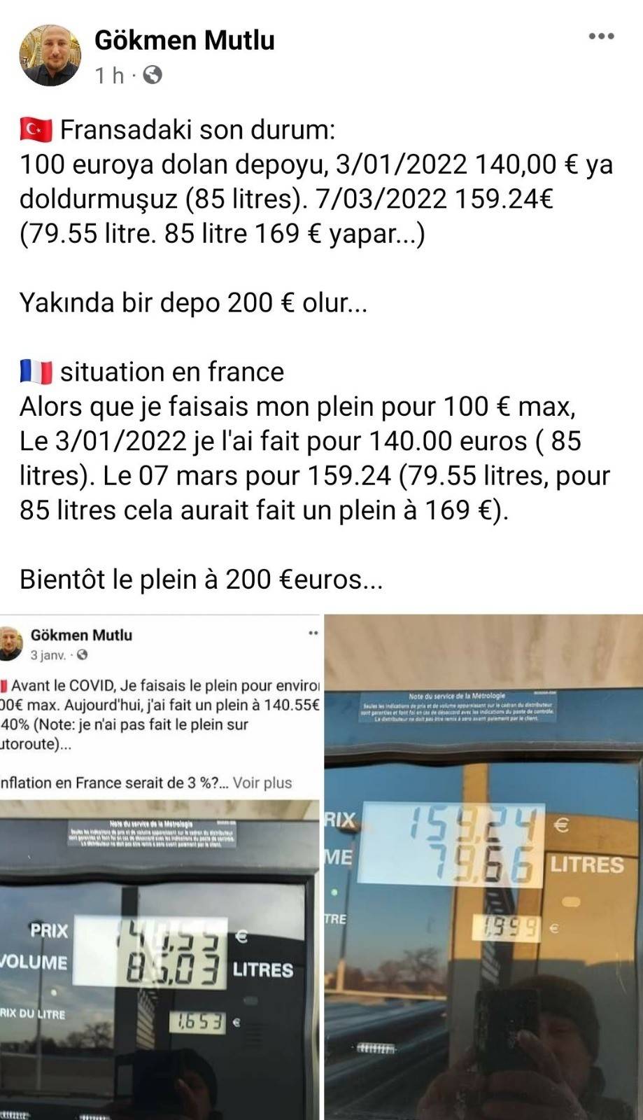 Fransa'da yaşayan Türk vatandaş Gökmen Mutlu, ülkede akaryakıta gelen zamma dikkat çektiği mesajında, geçen ay 100 euroya dolan deponun 7 Mart itibari ile 160 euroya dolduğunu aktardı.