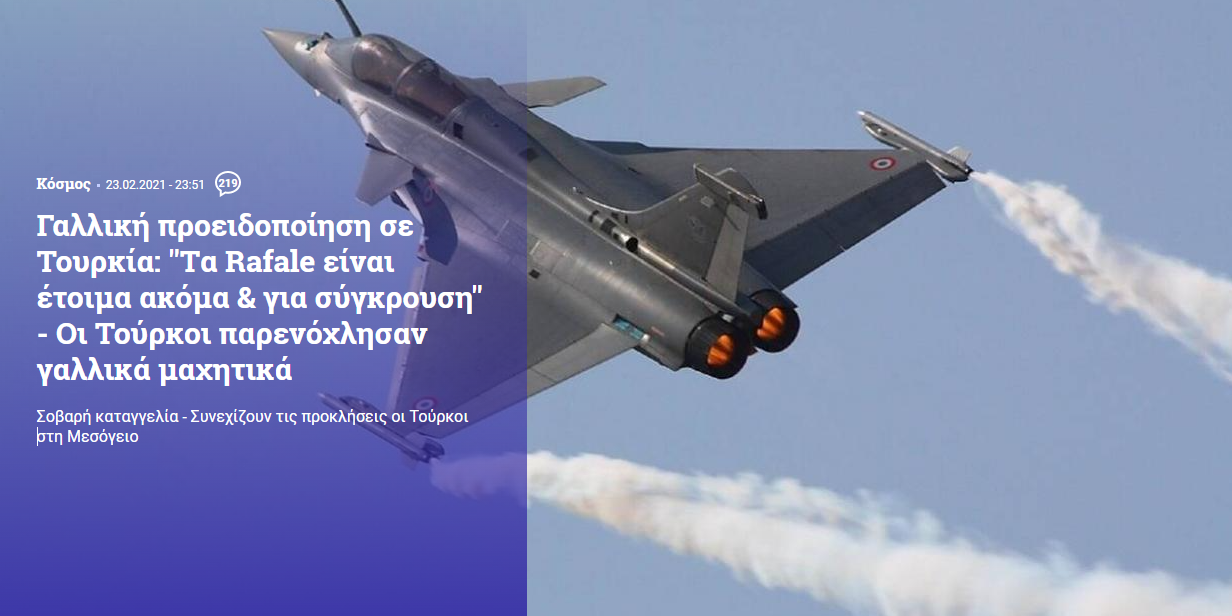 İsmini vermek istemeyen Fransız askeri yetkilinin Yunan basınına verdiği bir demeçte, geçen yaz Libya açıklarında Fransız ve Türk Deniz Kuvvetleri arasında meydana gelen olaydan sonra Akdeniz'de durumun kızıştığını belirterek, "Artık her şeye hazırız. Rafale savaşçıları zorlu silah sistemleriyle yüklüdür ve istedikleri zaman cevap verebilirler." dedi.