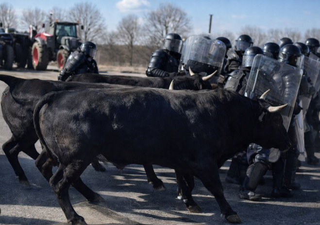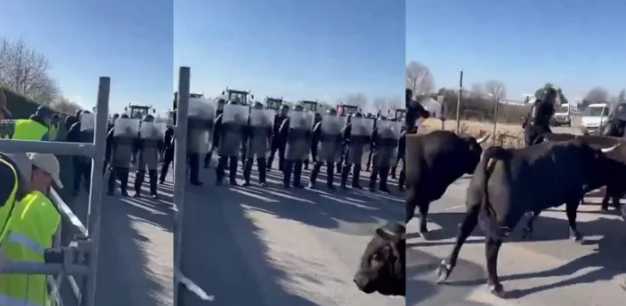 Fransa’da hükümetin tarım politikalarına ve yeni dünya düzeninin getirdiği kısıtlamalara karşı ayaklanan çiftçiler, eylemlerinde sınır tanımıyor. Polisin kurduğu barikatları aşamayan protestocular, bu kez boğaları sahaya sürdü.