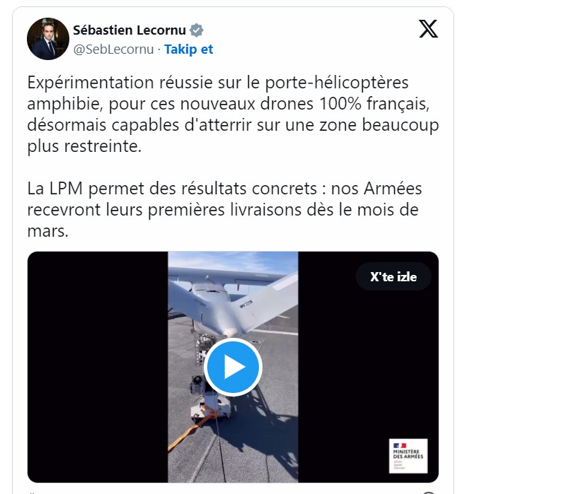 Konuyla ilgili paylaşımda bulunan Bakan Lecornu, “Artık çok daha kısıtlı bir alana iniş yapabilen bu yeni %100 Fransız İHA’ları için amfibi helikopter gemisinde başarılı denemeler yapıldı. Askeri Programlama Yasası (LPM) somut sonuçlar veriyor: Silahlı kuvvetlerimiz ilk teslimatlarını Mart ayında alacak.” ifadelerini kullandı.
