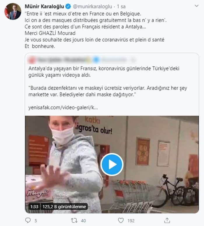Görüntünün yayılmasının ardından Antalya Valisi Münir Karaloğlu, Mourad Ghazli'nin videosunu sosyal medya hesabından paylaşarak teşekkür etti. Mourad Ghazli ise videoyu neden çektiğini ve yaşadığı süreci Demirören Haber Ajansı'na (DHA) anlattı. Ghazli, "Fransa dünyanın 6'ncı büyük ülkesi olmasına rağmen hiçbir tedbir yok. Maske yok, test sayısı çok az ve hastanelerde yeteri kadar yatak yok. Yeteri kadar yatak olmamasından dolayı hastalarımızı tren veya uçakla yurt dışına gönderiyoruz. Ben burada bu videoyla Türkiye'nin bir model olduğunu göstermek istedim. Çünkü Türkiye hükümeti vatandaşlarına haftada beş maske dağıtıyor. Covid-19 hastalığını tespit etmek için çok yoğun bir şekilde testler uyguluyor. Bütün hastaları barındıracak kapasitede hastaneye sahip" diye konuştu.