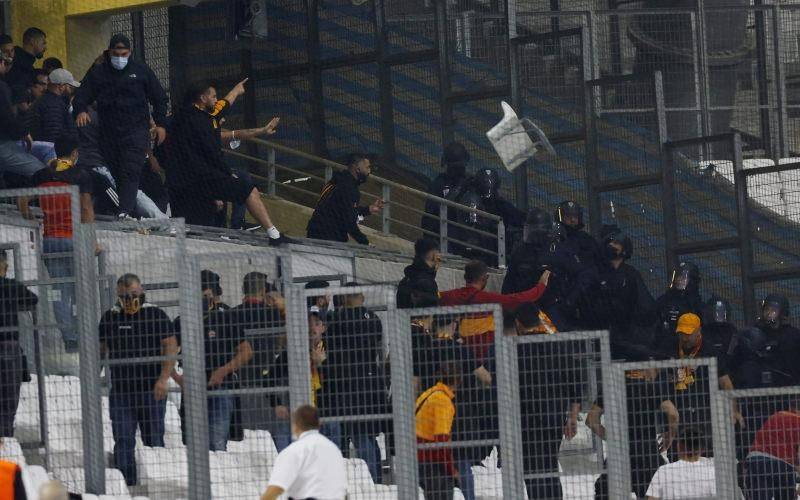 Bir Fransız taraftarın Galatasaray taraftarının bulunduğu tribüne yaklaşarak Yunanistan bayrağı açmasına tepki gösteren Sarı Kırmızılı ekip taraftarlarına Fransız polisi müdahale etti.