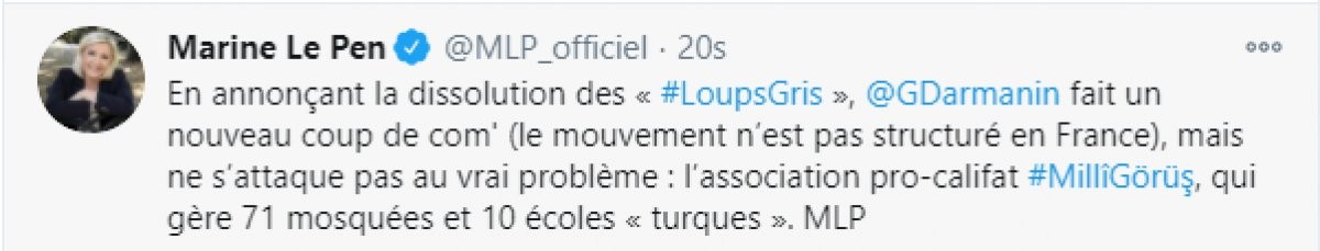 Le Pen mesajında Milli Görüş'ün "Hilafet yanlısı olduğunu" belirterek 71 cami ve 10 Türk okulunu idare ettiğini öne sürdü.