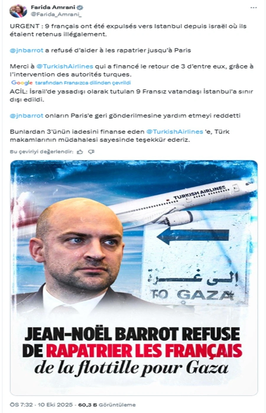 Fransız Milletvekili Farida Amrani, İsrail tarafından alıkonulan Özgürlük Filosu'ndaki 3 Fransız aktivistin ülkelerine dönmesine yardım eden AK Partili vekillere ve Türk Hava Yolları'na (THY) teşekkür etti. Amrani, Fransız Dışişleri Bakanı Jean-Noel Barrot'un ise vatandaşlarının dönüşüne yardımcı olmayı reddederek onları terk ettiğini söyledi.