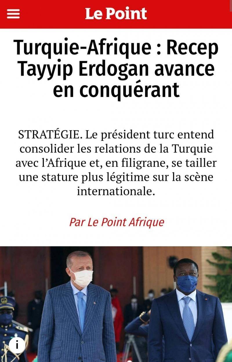 "Türkiye-Afrika : Recep Tayyip Erdoğan fatih olarak ilerliyor" başlığının kullanıldığı haberde, "Türkiye Cumhurbaşkanı ülkesinin Afrika ile ilişkilerini sağlamlaştırmayı ve böylece uluslararası sahnede daha meşru bir konum elde etmeyi amaçlıyor" ifadelerine yer verildi.