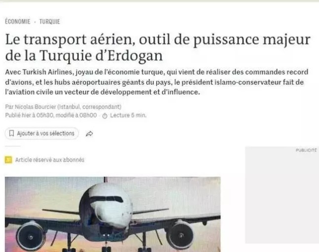 Türkiye'nin kurucusu Gazi Mustafa Kemal'in "İstikbal göklerdedir" sözüyle başlayan haberinde Le Monde, THY'nin elde ettiği sonuçların bu zamana kadar görülmemiş boyutlara ulaştığını belirtti.