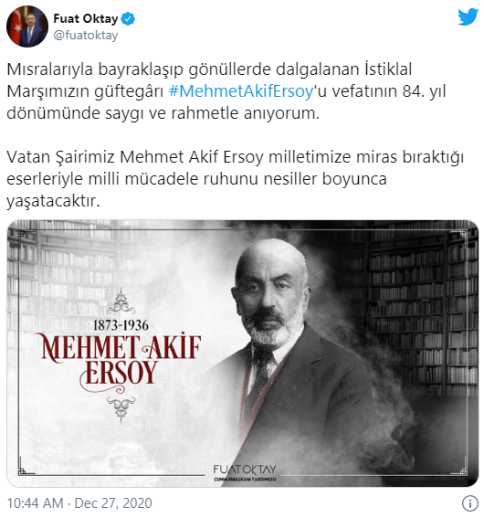 Bingöl de Akif karakterini oynamanın kendisi için bir şeref olduğunu vurgularak, "Cumhurbaşkanı Yardımcımız Fuat Bey'in sete kadar gelerek, Mehmet Akif Ersoy'un hayatını çeken ekibin yanında olması bizi ayrıca şereflendirmiş ve gururlandırmıştır. Bu nazik ziyaretlerinden dolayı Sayın Cumhurbaşkanı Yardımcımıza çok çok teşekkür ediyoruz." dedi.