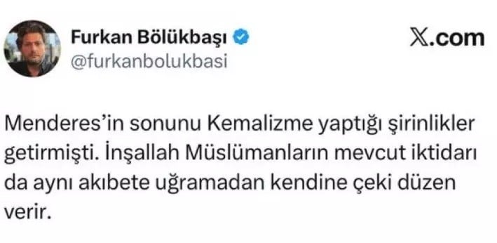 İstanbul Anadolu Cumhuriyet Başsavcılığı, X kullanıcısı Furkan Bölükbaşı hakkında resen soruşturma başlattı. Cumhurbaşkanına yönelik yaptığı paylaşım gerekçe gösterilerek, Bölükbaşı hakkında gözaltı talimatı verildi. Başsavcılık, soruşturmanın TCK'nın 310. maddesi uyarınca başlatıldığını ve işlemlerin titizlikle devam ettiğini duyurdu.