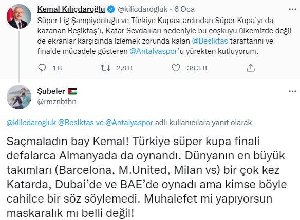 Söz konusu paylaşımın altına binlerce yorum yazılırken ‘Şubeler’ isimli sosyal medya kullanıcısı, “Saçmaladın bay Kemal! Türkiye süper kupa finali defalarca Almanya’da da oynandı. Dünyanın en büyük takımları (Barcelona, M.United, Milan vs) birçok kez Katar’da, Dubai’de ve BAE’de oynadı ama kimse böyle cahilce bir söz söylemedi. Muhalefet mi yapıyorsun maskaralık mı belli değil!” diyerek Kılıçdaroğlu’na soğuk duş aldırdı.