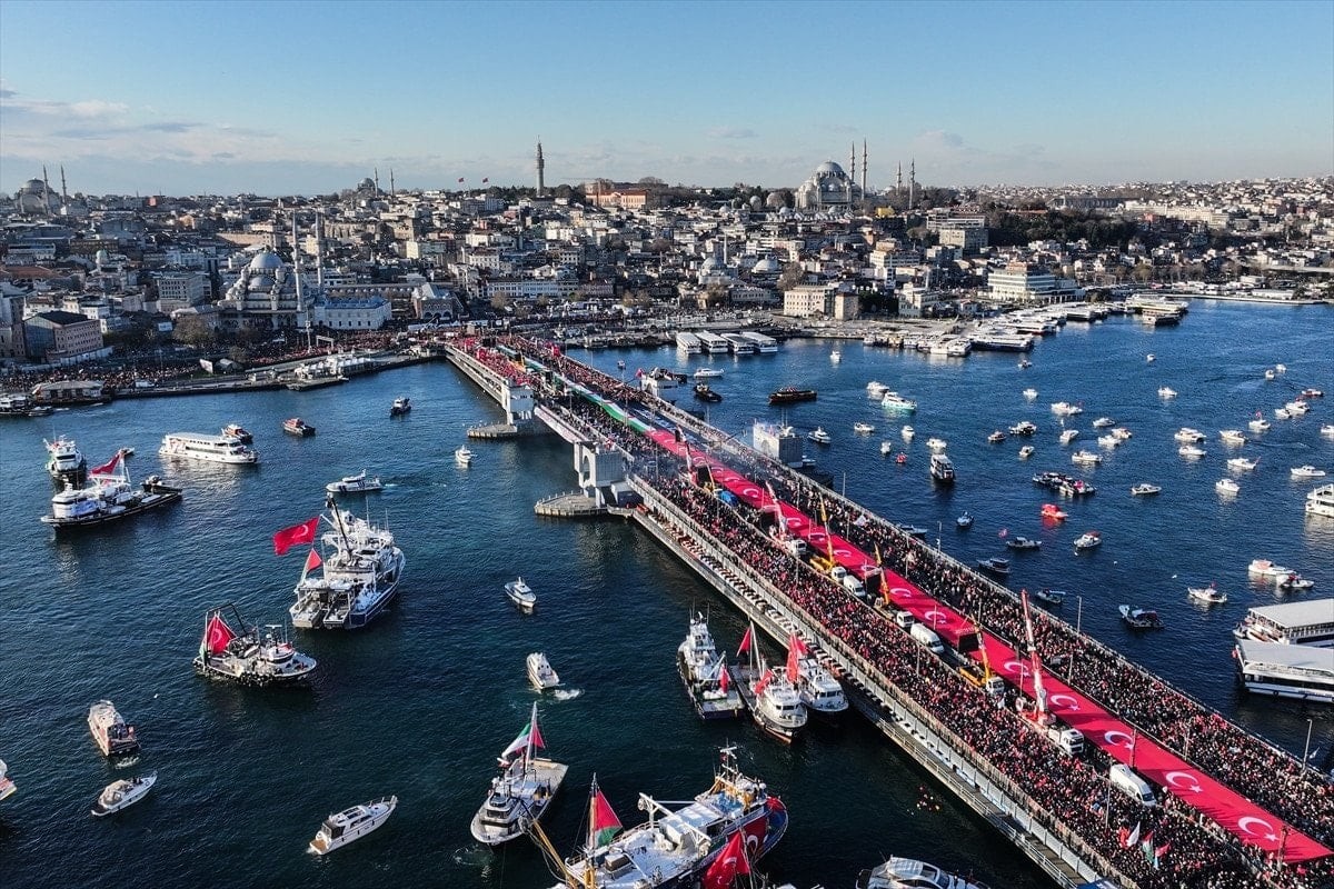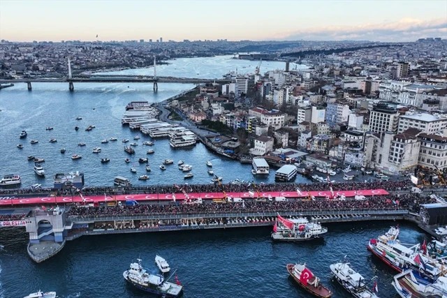 Galata Köprüsü'nde 'Büyük Gazze Yürüyüşü' düzenlendi. Yürüyüşe katılanlar Sultanahmet Meydanı'ndan sabahın erken saatlerinde Galata Köprüsü'ne doğru yürüyüşe geçti. Yürüyüşe Ticaret Bakanı Ömer Bolat, Adalet Bakanı Yılmaz Tunç, eski Milli Savunma Bakanı ve TBMM Milli Savunma Komisyonu Başkanı Hulusi Akar, Gençlik ve Spor Bakanı Osman Aşkın Bak, Sağlık Bakanı Kemal Memişoğlu ile vatandaşlar katıldı. Yürüyüşe katılanlar ellerindeki Türk ve Filistin bayraklarının yanı sıra omuzlarındaki kefiyelerle Flistin ve Gazze'deki zulme dikkat çekti. Yürüyüşe katılan binlerce kişi İsrail'in Filistin'e saldırılarının durdurulması için Galata Köprüsü'nden çağrıda bulundu.