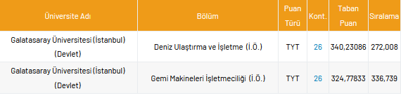 Galatarasay Üniversitesi 2 yıllık taban puanları 2021, yüzdelik dilimleri ve kontenjan sayıları kaçtır?
