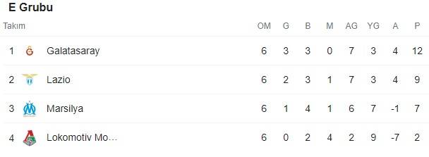 Galatasaray E Grubu puan durumu | UEFA Avrupa Ligi E Grubu son maçında İtalya'nın Lazio takımıyla 0-0 berabere kalan Galatasaray, grubunu lider tamamlayarak son 16 turuna yükseldi. Galatasaray gruptan kaç puanla çıktı?