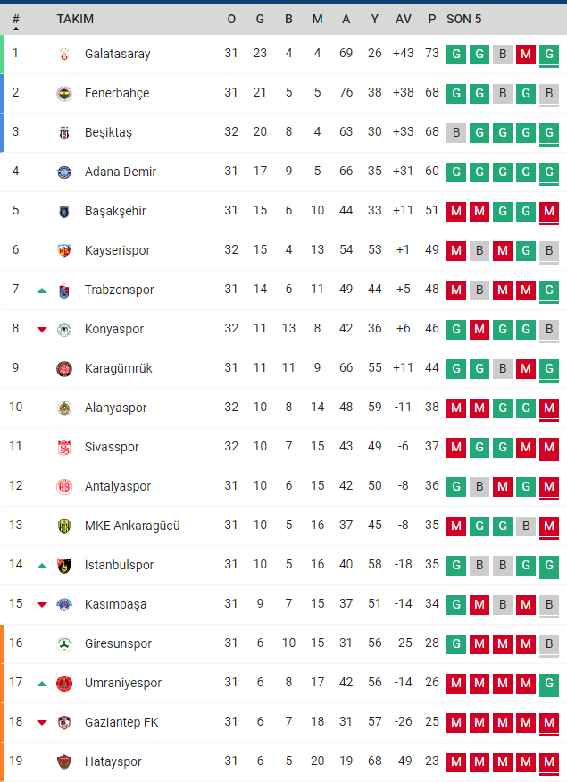Süper Lig’de Beşiktaş mağlubiyetinin ardından sahasında Başakşehir’i yenen lider Galatasaray, 73 puana yükseldi. Sarı-kırmızılı takım, Fenerbahçe ve Beşiktaş ile puan farkını 5'e yükseltti. Konuk takım Başakşehir ise 2 maçlık galibiyet serisinin ardından mağlup oldu ve 51 puanda kaldı.