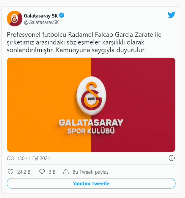 Galatasaray'dan yapılan açıklamada "Profesyonel futbolcu Radamel Falcao Garcia Zarate ile şirketimiz arasındaki sözleşmeler karşılıklı olarak sonlandırılmıştır. Kamuoyuna saygıyla duyurulur." ifadeleri yer aldı.