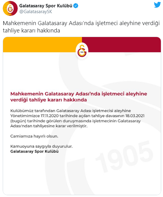 "Kulübümüz tarafından Galatasaray Adası işletmecisi aleyhine Yönetimimizce 17.11.2020 tarihinde açılan tahliye davasının 18.03.2021 (bugün) tarihinde görülen duruşmasında işletmecinin Galatasaray Adası'ndan tahliyesine karar verilmiştir. Camiamıza hayırlı olsun"