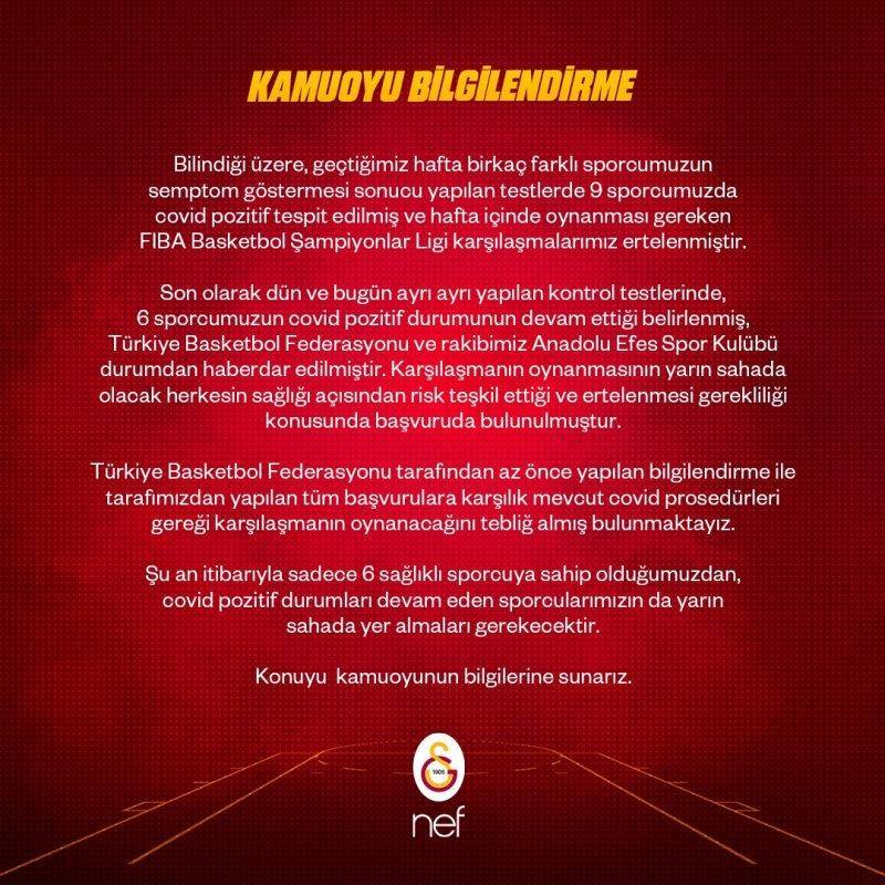 "Bilindiği üzere, geçtiğimiz hafta birkaç farklı sporcumuzun semptom göstermesi sonucu yapılan testlerde 9 sporcumuzda covid pozitif tespit edilmiş ve hafta içinde oynanması gereken FIBA Basketbol Şampiyonlar Ligi karşılaşmalarımız ertelenmiştir.