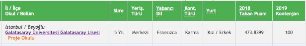 Liseye Geçiş Sınavı yani LGS 2019 sınavına girecek öğrenciler başvurularını 3-14 Nisan tarihleri arasında yapıldı. İyi bir lisede okumak isteyen 8. Sınıf öğrencileri 1 Haziran’da yapılacak olan 2019 LGS sınavına hazırlanırken bir yandan da lise taban puanlarının yanında lise başarı sıralasını merak ediyor. Galatasaray Lisesi taban puanı 2019, İstanbul Galatasaray Lisesi taban puanı 2019 başarı sıralaması yüzdelik dilimleri.