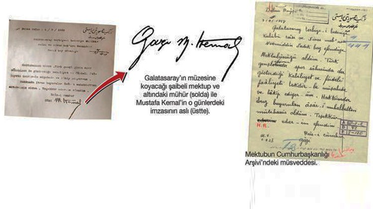 Çalışma müsaademin bulunduğu Cumhurbaşkanlığı Arşivi’ne müracaat ettim, mektubun yine Lâtin harfleri ile kaleme alınmış orijinal müsveddesi arandı ve bulundu. Ankara’dan gelen belge ile Galatasaray Kulübü’nün müzesindeki mektubun görüntülerini burada yayınlıyorum...