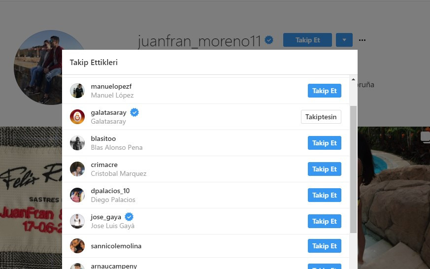 Juanfran Moreno, Galatasaray'ın resmi Instagram hesabını takibe aldı. Son dönemde fazlasıyla rastladığımız bu olaylar transferin habercisi olarak lanse ediliyor.