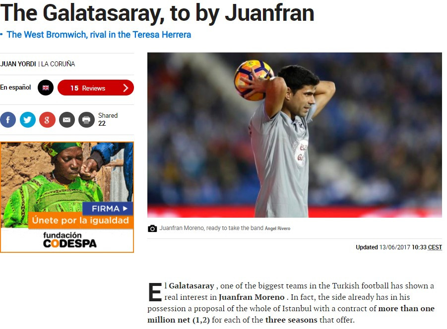 İspanyol Marca Gazetesi, Deportivo forması giyen Juanfran Moreno'ya Galatasaray'ın 3 yıllık sözleşme önerdiğini yazdı. Yaklaşık olarak yıllık 1.2 milyon euro kazanacak olan Moreno'nun İspanya'dan kesin olarak ayrılacağını ifade edildi.