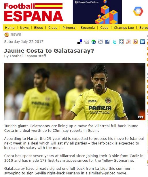 Galatasaray, Villarreal'in 29 yaşındaki sol beki Jaume Costa'yı 5 milyon Euro bedelle kadrosuna katmak üzere.