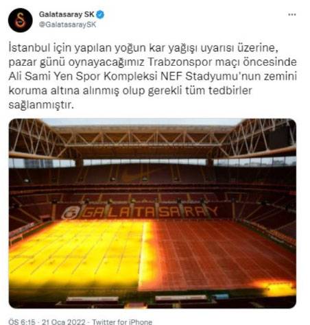 Galatasaray kulübü de konuşulan erteleme ihtimali konusunda açıklama yaptı. Sarı kırmızılı ekipten yapılan açıklamada zeminin koruma altına alındığı belirtildi. Galatasaray'dan yapılan açıklamada "İstanbul için yapılan yoğun kar yağışı uyarısı üzerine, pazar günü oynayacağımız Trabzonspor maçı öncesinde Ali Sami Yen Spor Kompleksi NEF Stadyumu'nun zemini koruma altına alınmış olup gerekli tüm tedbirler sağlanmıştır." İfadeleri kullanıldı.